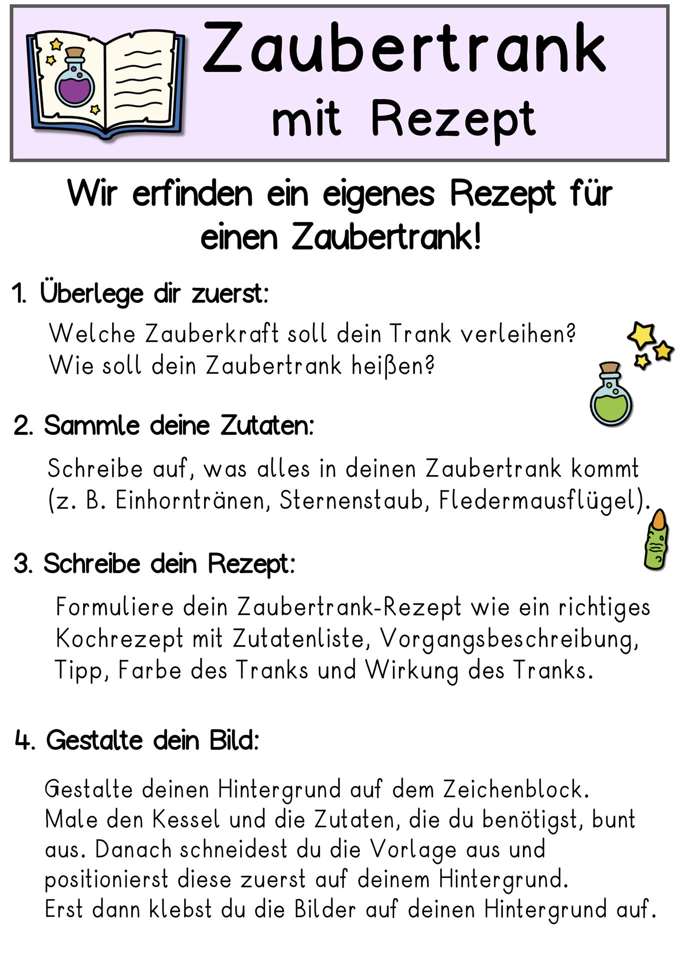 Kreative Schreibaufgabe: Deine Schüler*innen entwickeln ein einzigartiges Zaubertrank-Rezept mit Zutatenliste, Zubereitung und Wirkung. Arbeitsblätter mit den Lineaturen für Klasse 2, Klasse 3 und ab Klasse 4.