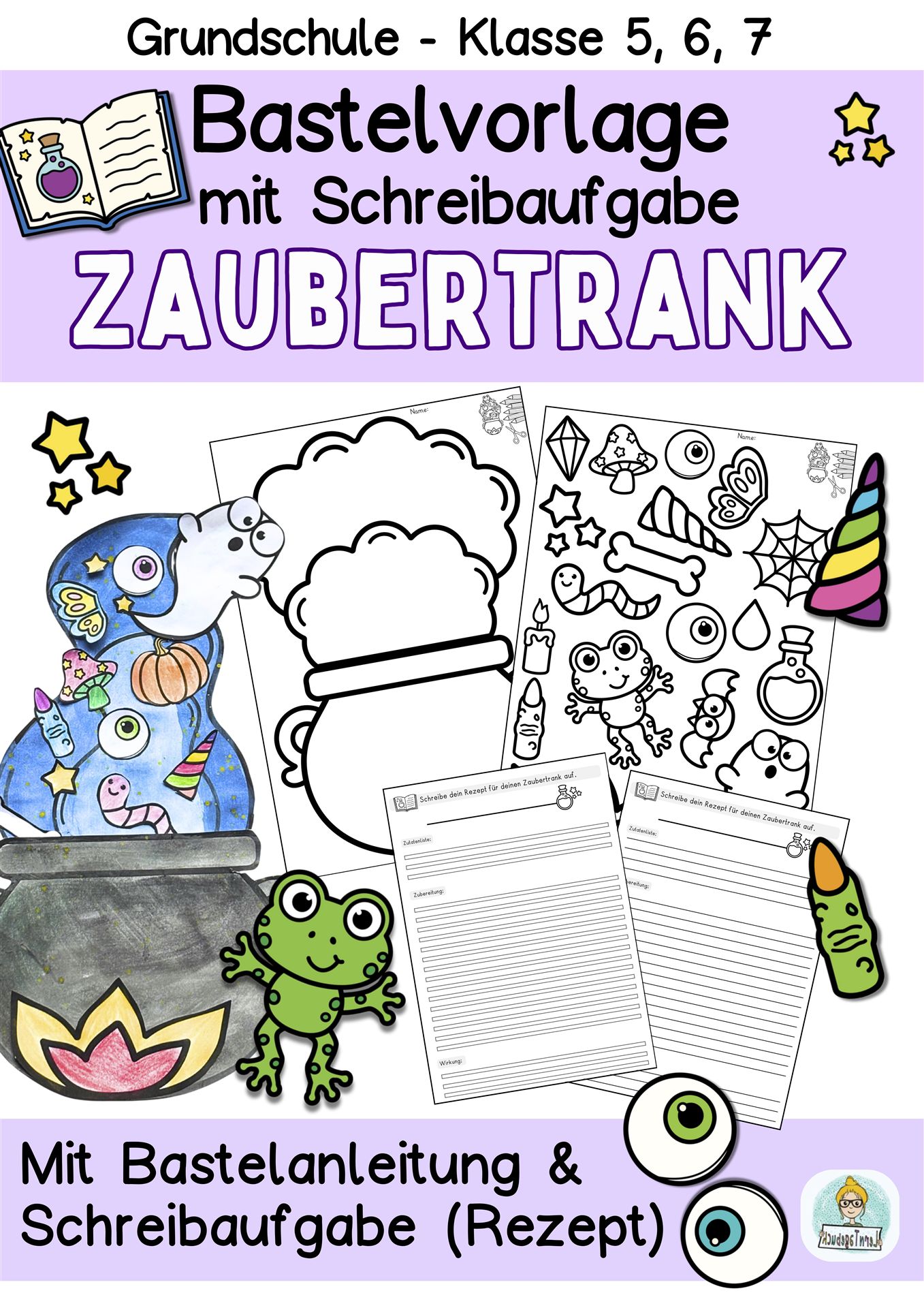 Bastelvorlage zum Ausmalen und Gestalten von Zaubertränken mit Schreibaufgabe: Schreibe ein Rezept zu deinem Zaubertrank und bastle dann dein Bild zum Rezept.