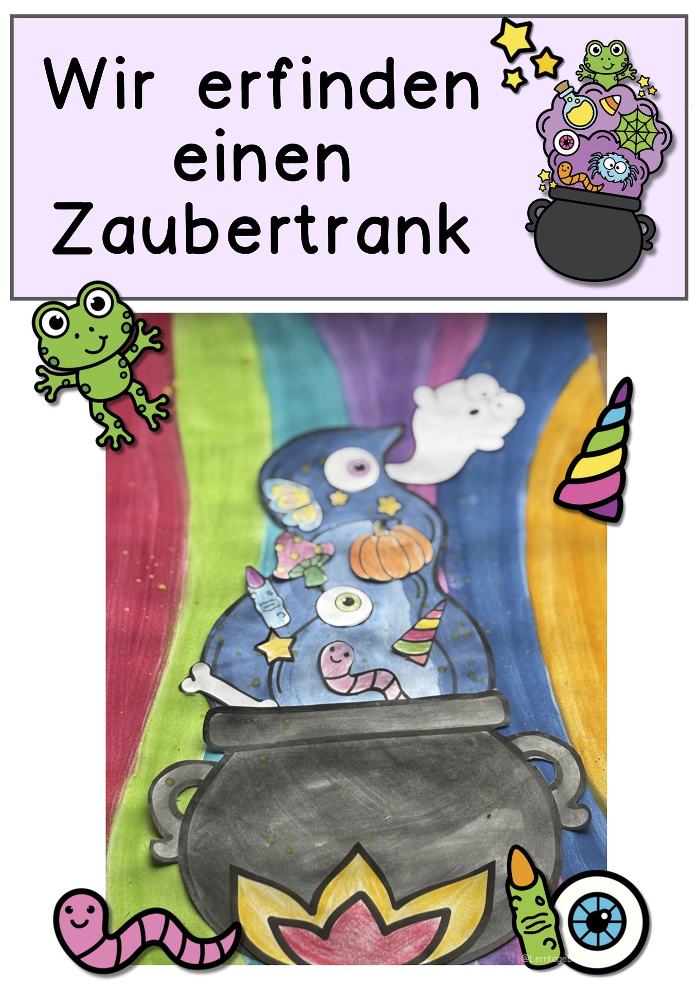 Eine kreative Bastelidee für Kinder zum Ausmalen und Basteln, ideal mit oder ohne Schreibauftrag. Dieses Kunstprojekt eröffnet Kindern die Freiheit, ihre Kreativität rund um Halloween zu entfalten: Welche Zutaten stecken in meinem Zaubertank? Welche Farben besitzen sie? Gestalte einen fantasievollen Hintergrund auf dem Zeichenblock, passend zum Zaubertrank.