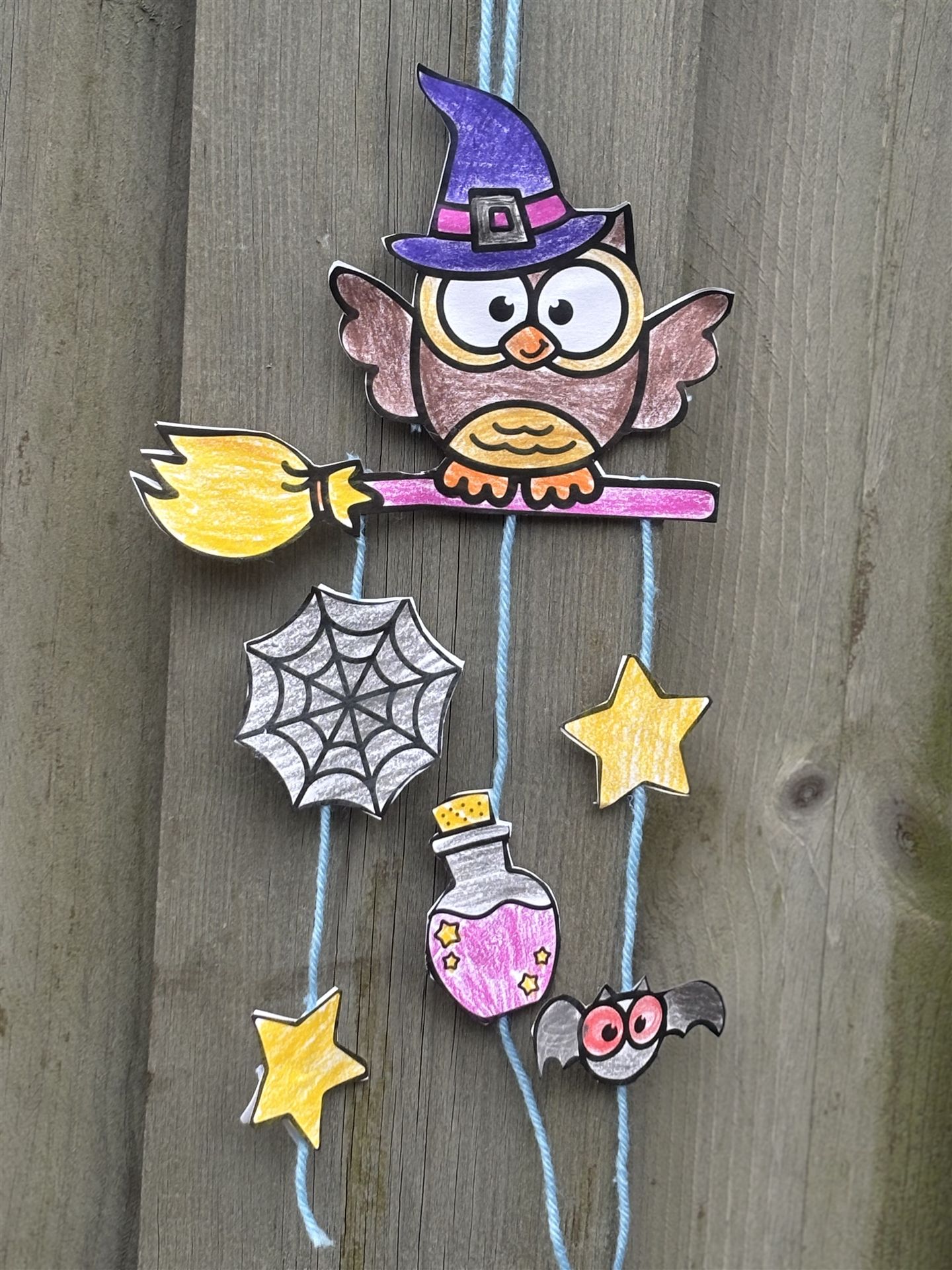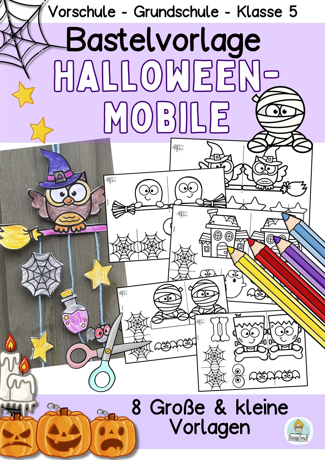 Halloween-Mobile basteln mit Motiven wie Eule, Geist, Mumie, Vampir, Werwolf, Spukhaus oder Frankenstein. 🎨✂️