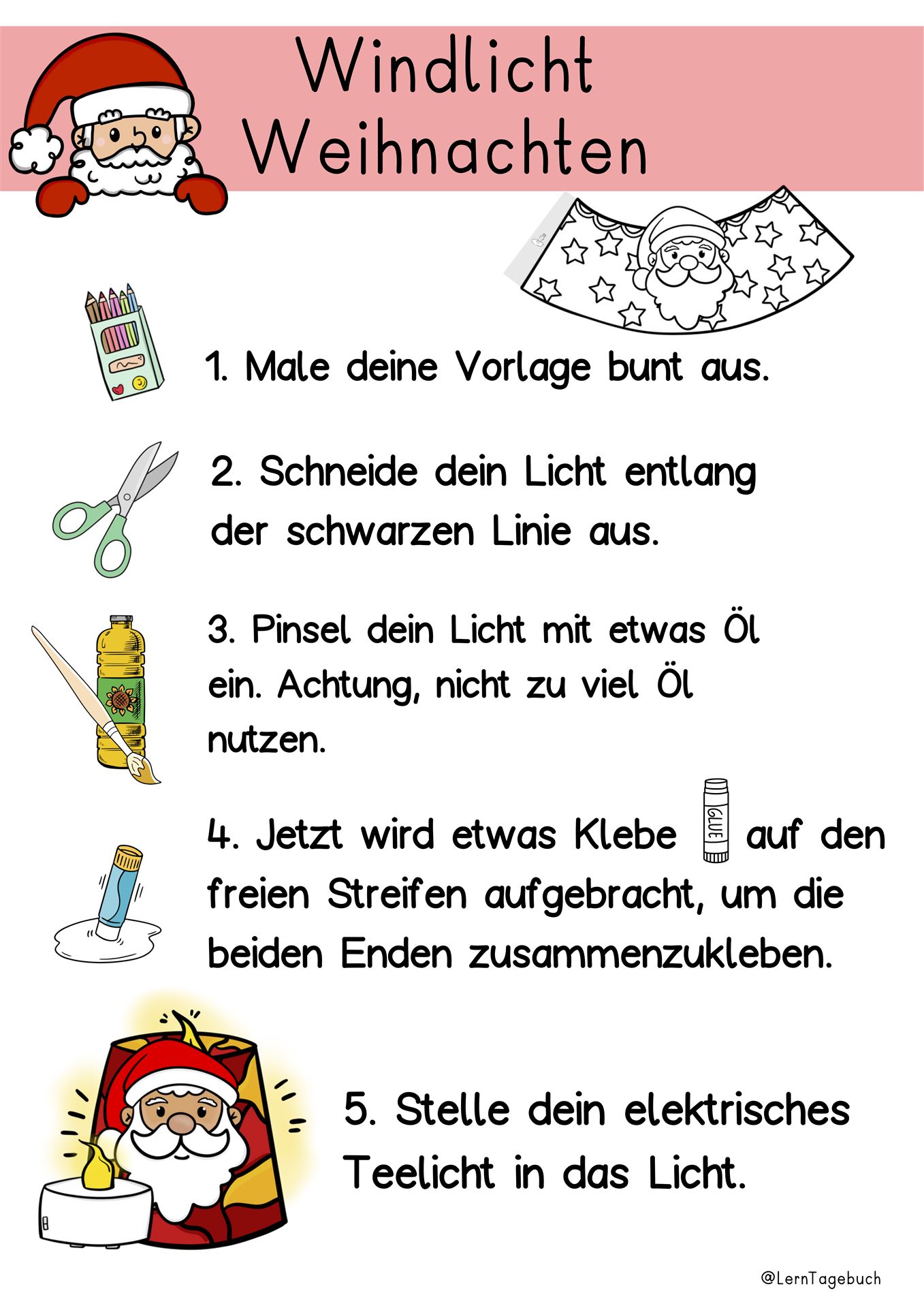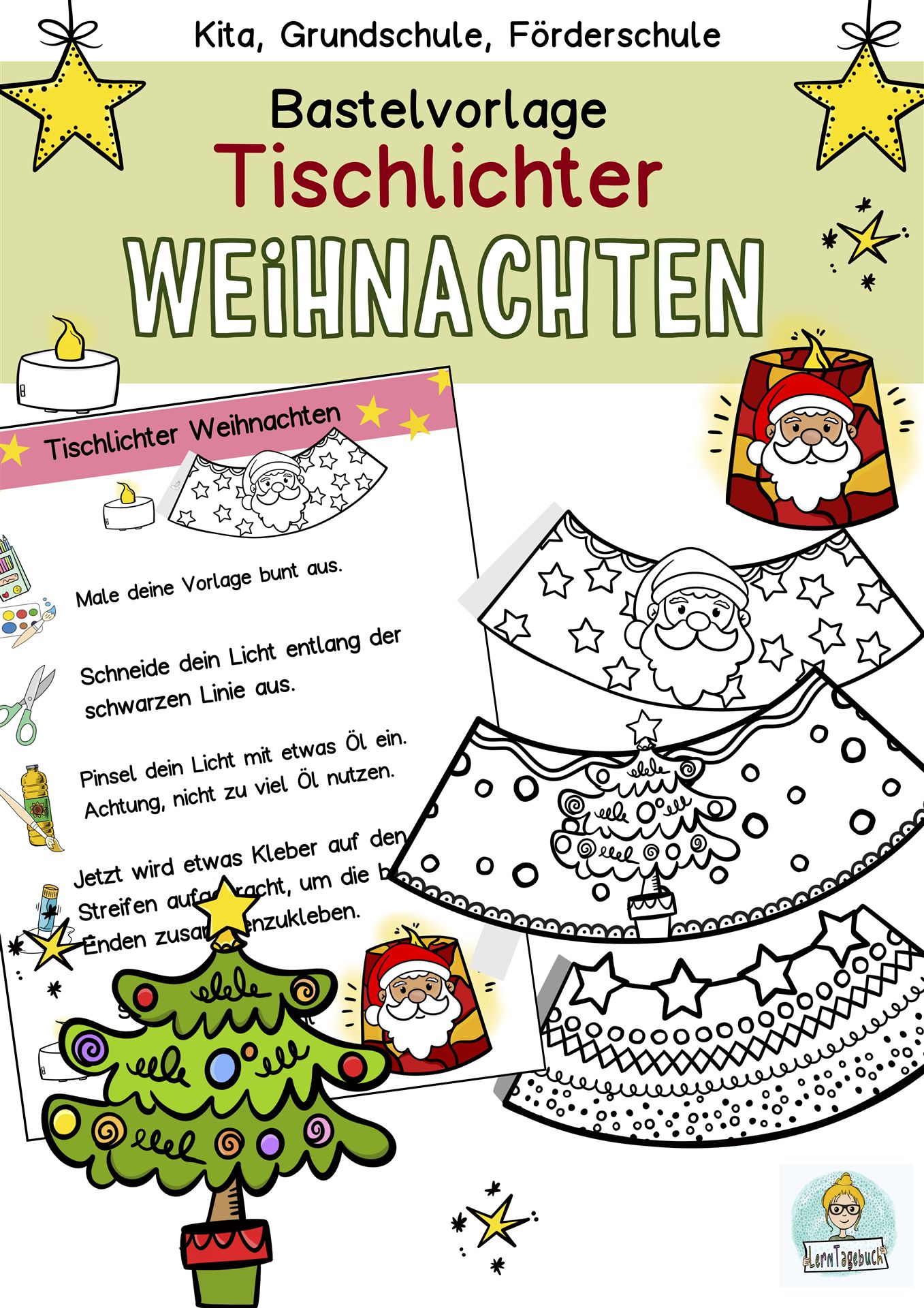 Weihnachten Windlichter/Tischlichter, Bastelvorlagen aus Papier zum Ausmalen und Basteln mit Kindern im Kindergarten, Vorschule oder im Kunstunterricht in der Grundschule und Förderschule.