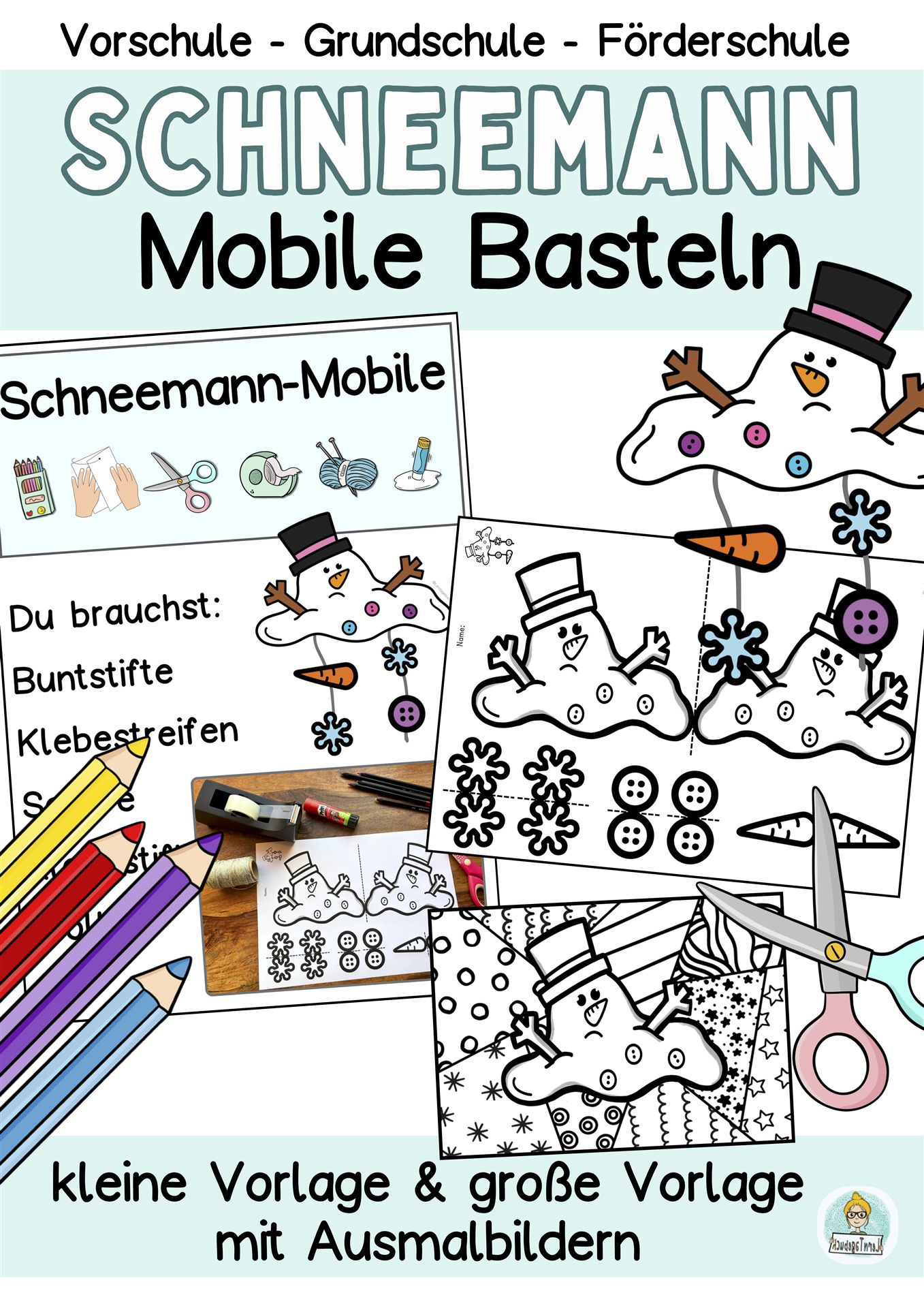 Einfache Bastelvorlage Schneemann-Mobile: Vorlage aus Papier zum Ausmalen und Basteln für Kinder als Winter-Fensterbild im Kindergarten, Grundschule, Förderschule und als Beschäftigungsangebot für Kinder zu Hause.