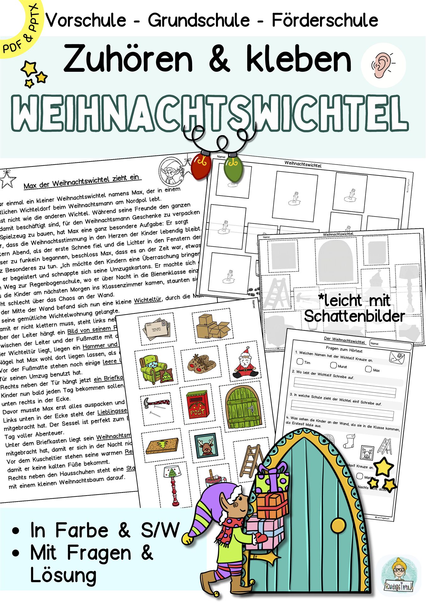 Erlebe eine kreative Hörübung, die aktives Zuhören, Konzentration und Hörverstehen gezielt stärkt. Max, der kleine Weihnachtswichtel, zieht ein. Die Kinder hören aufmerksam zu, schneiden aus und kleben passende Bilder auf das Arbeitsblatt auf. Ideal als Lernspiel im Deutschunterricht, DaZ/DaF, Förderunterricht, Vorschule und Kindergarten.