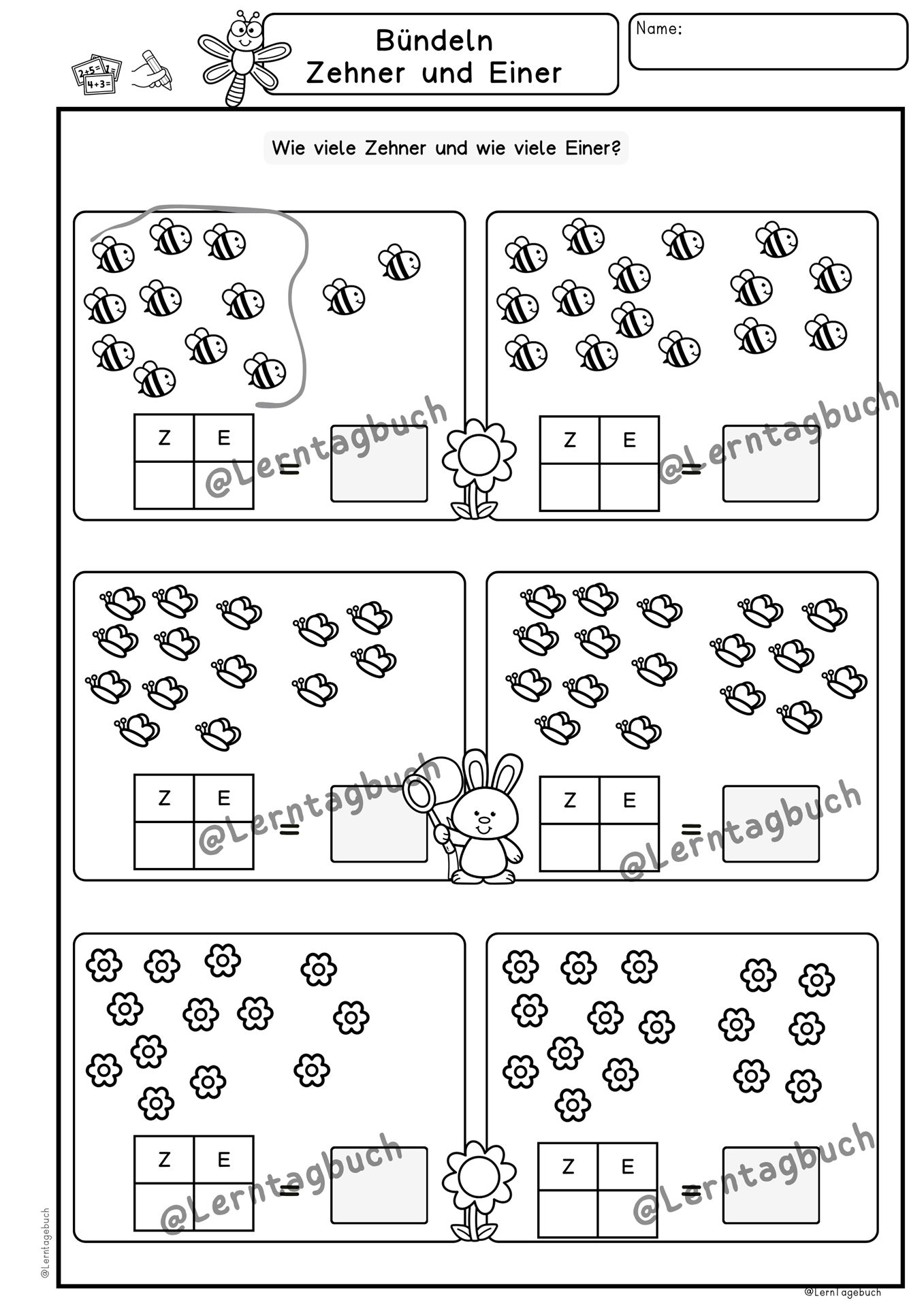 Mathe 1. Klasse Arbeitsblätter für ein Lernheft oder Förderheft im Frühling mit Lösungen zum Ausdrucken. Abwechslungsreiche Übungen zum Rechnen lernen im ZR bis 10, ZR bis 20, Formen, verliebte Zahlen, Ergänzen und Geld.