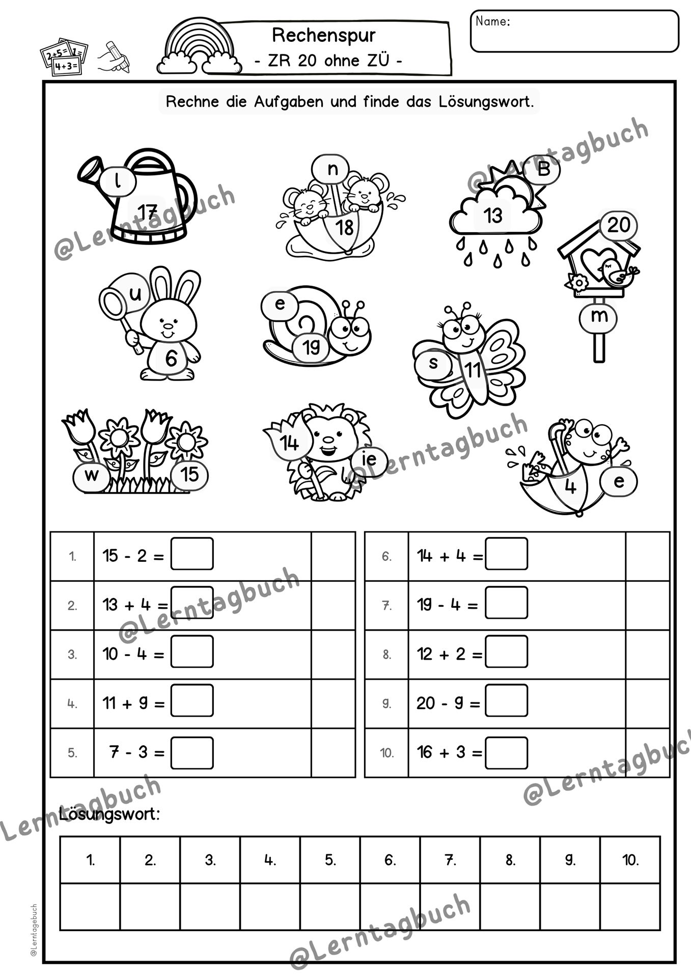 Abwechslungsreiche Übungen zum Rechnen lernen im ZR bis 10, ZR bis 20, Formen, verliebte Zahlen, Ergänzen und Geld.