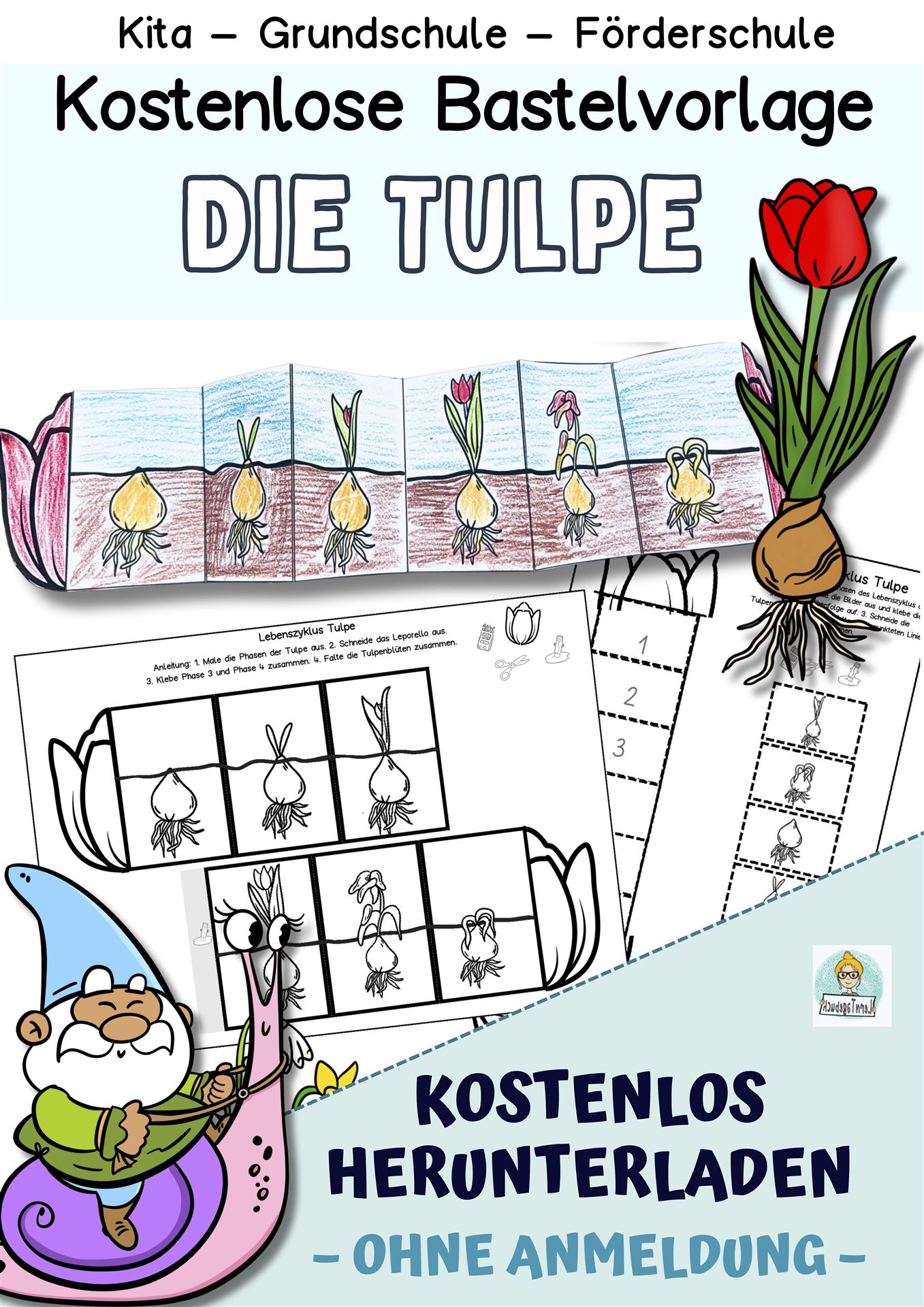 Frühblüher sind die ersten Vorboten des Frühlings und faszinieren Kinder im Kindergarten, in der Grundschule und in der Förderschule. Im Sachunterricht ermöglichen sie, die Natur zu erforschen und spannende Fragen zu beantworten. 🌱 Mit der kostenlosen Leporello-Bastelvorlage (in Farbe und S/W zum Ausmalen) lernen die Kinder den Lebenszyklus der Tulpe anschaulich und spielerisch kennen. Durch das Leporello-Format entsteht ein übersichtliches Faltbuch, das die einzelnen Wachstumsphasen der Tulpe Schritt für Schritt darstellt. Die Vorlage ist ideal, um später in ein Heft geklebt zu werden, oder kann als Vorlage für ein Lapbook im Sachunterrichtsordner genutzt werden