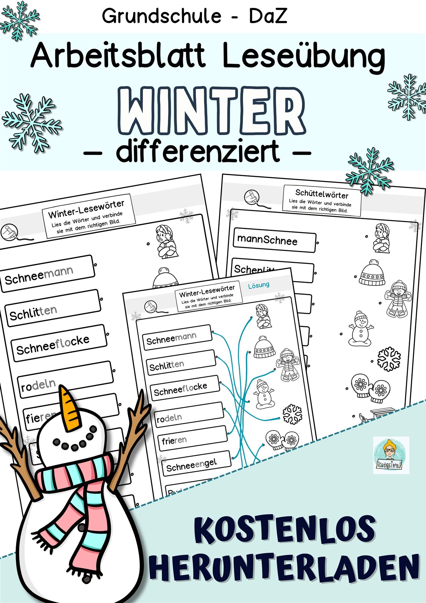 Differenziertes Arbeitsblatt zum Lesetraining und Leseverstehen von Winterwörtern, um die Lesekompetenz spielerisch zu fördern. Die Leseblätter eignen sich ideal zur Förderung im Deutschunterricht, für eine Lesetheke, in der Lesezeit, als Lesehausaufgabe oder im Förderunterricht.