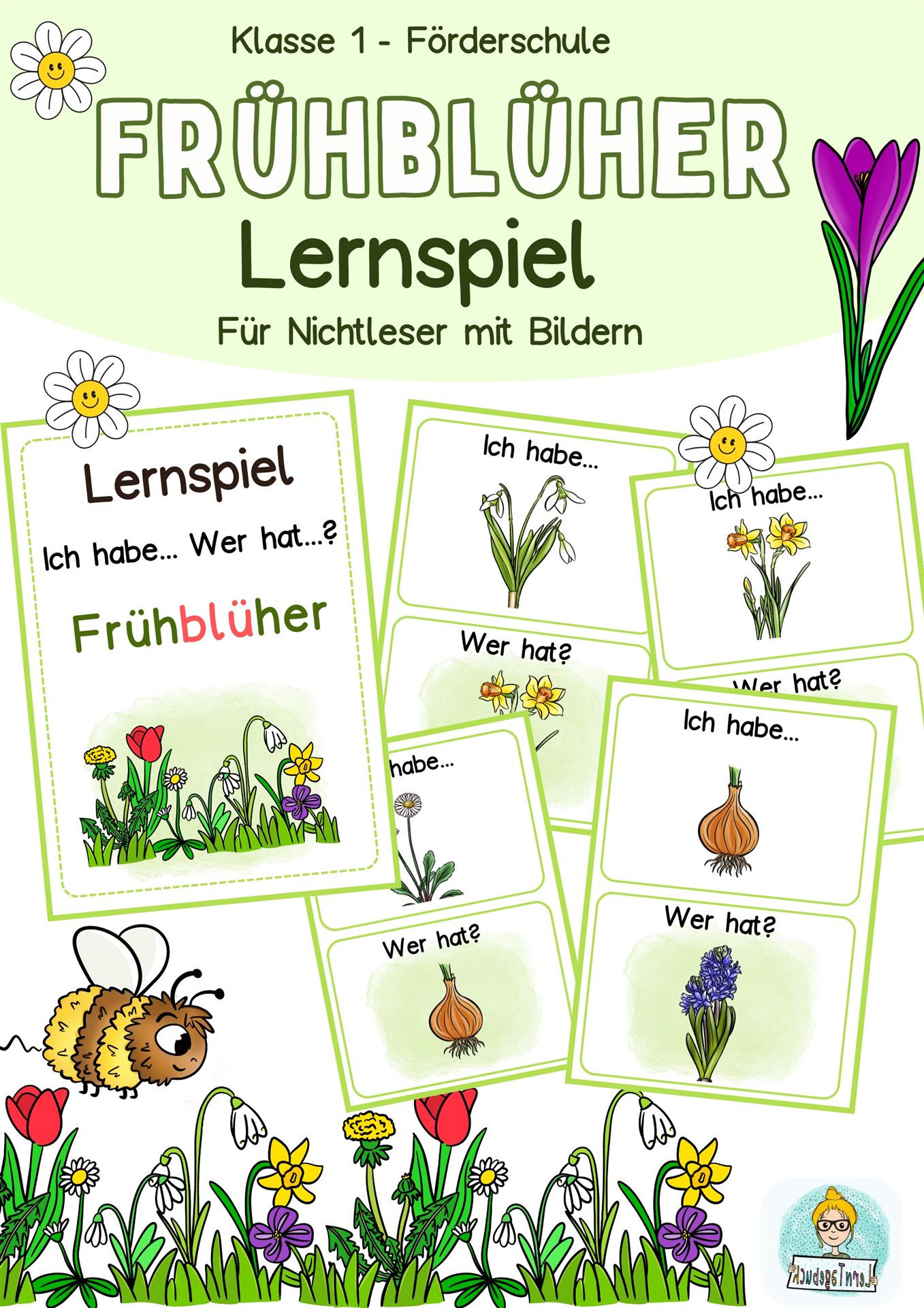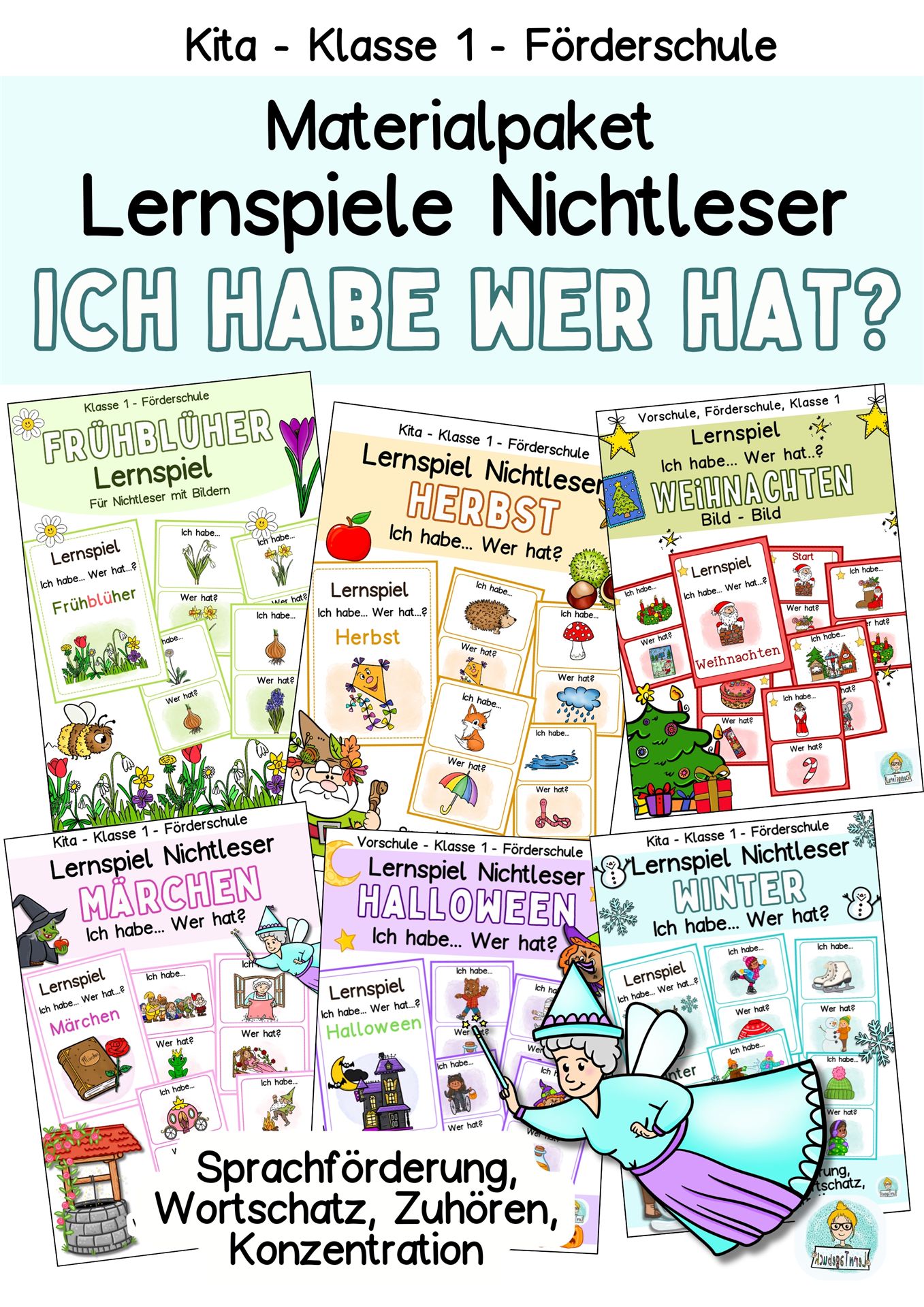 Ein spielerisches Lernpaket für Nichtleser: „Ich habe… Wer hat…?“ Das Paket fördert Wortschatz, Hörverstehen, Spracheinsatz und soziale Interaktion in der Kleingruppe. Durch wieder verwendbare Karten und klare Bilder eignet es sich für gezielte Förderunterricht.