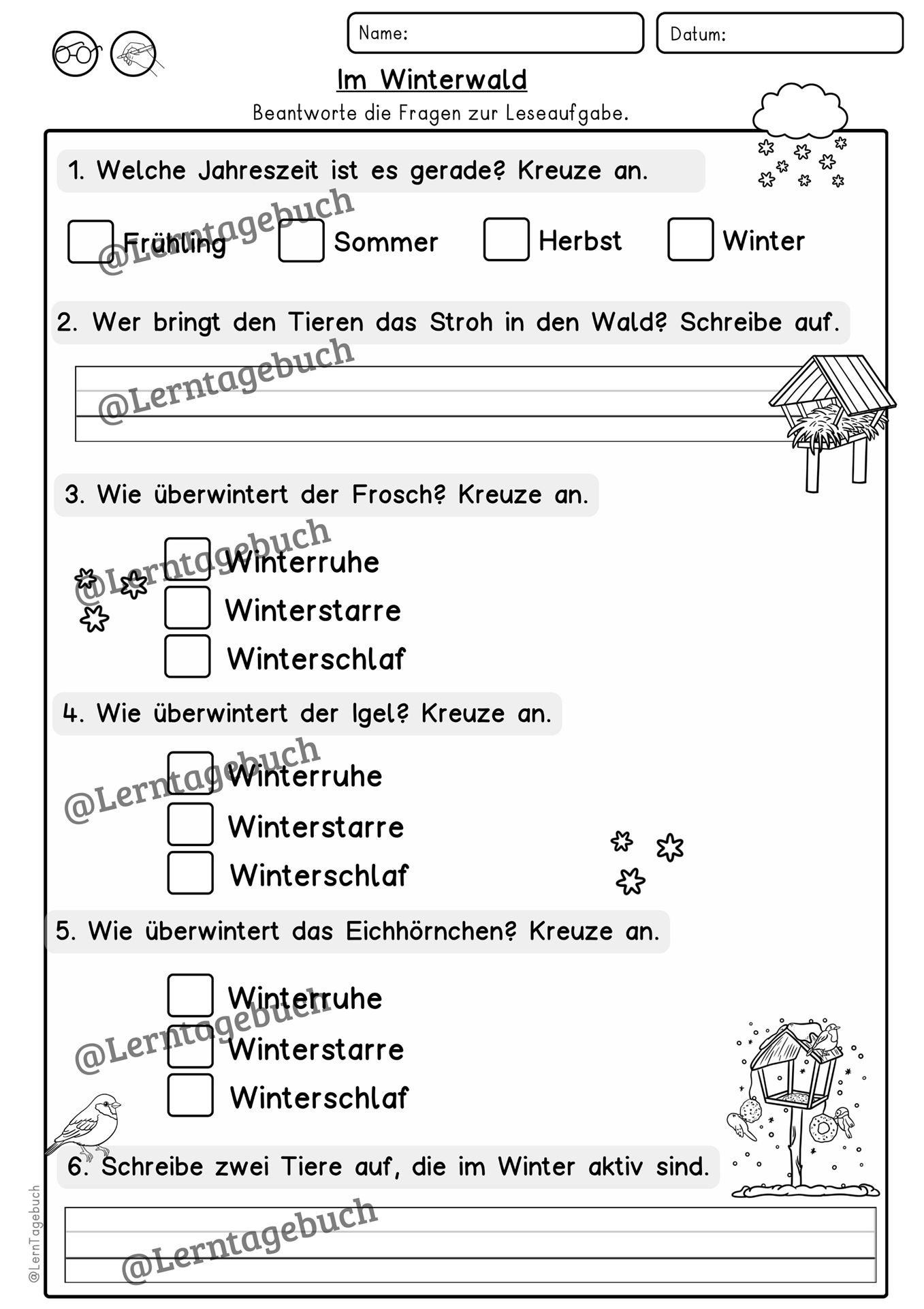 Drei Arbeitsblätter mit differenzierter Leseaufgabe Tiere im Winterwald.
