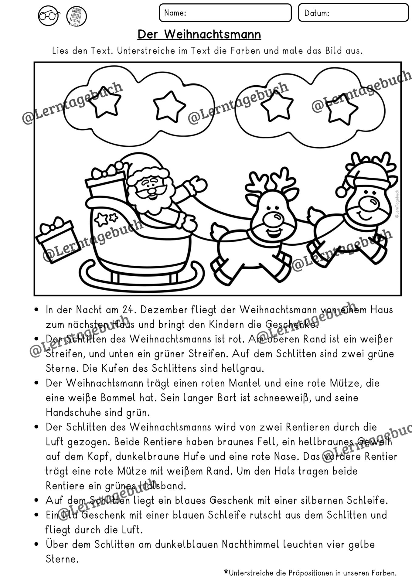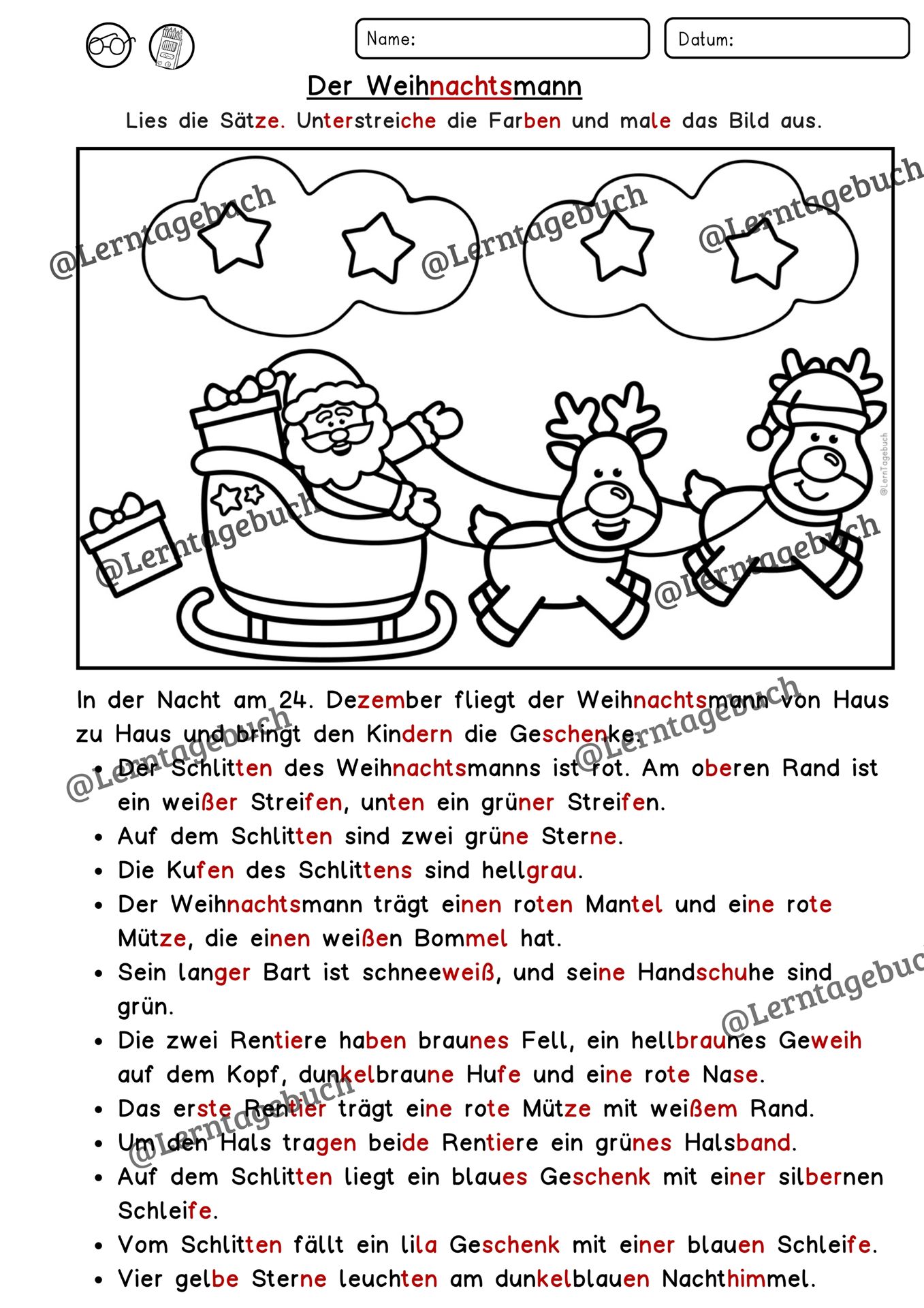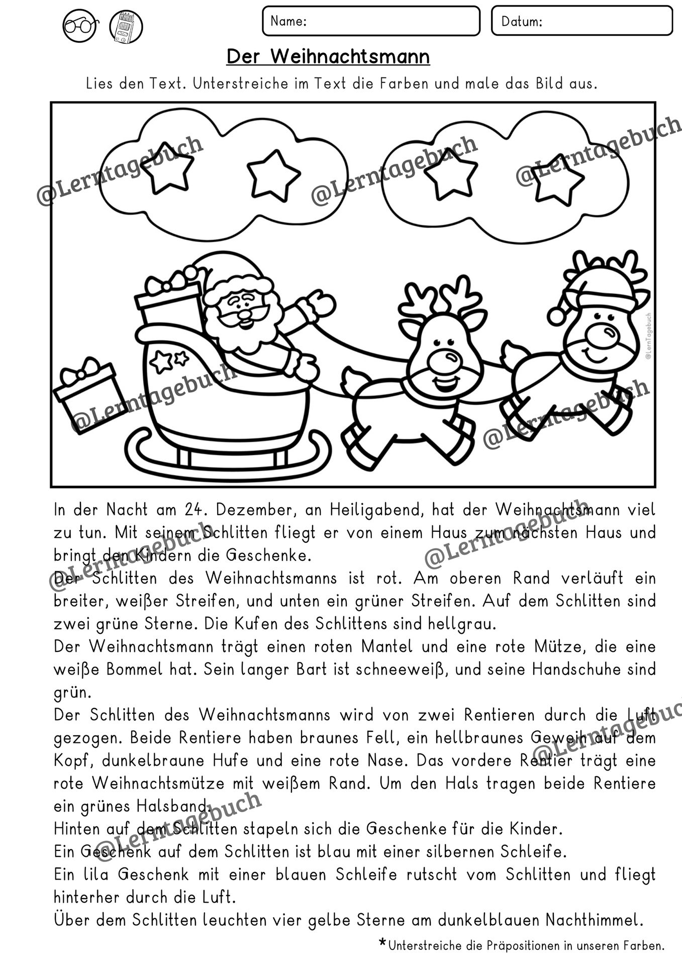 Leseübung Lesen und Malen Weihnachten/ Weihnachtsmann. Differenzierter Lesetext zum Lesenlernen, mit Lösung. Deutsch Klasse 2, 3, 4, DaZ.