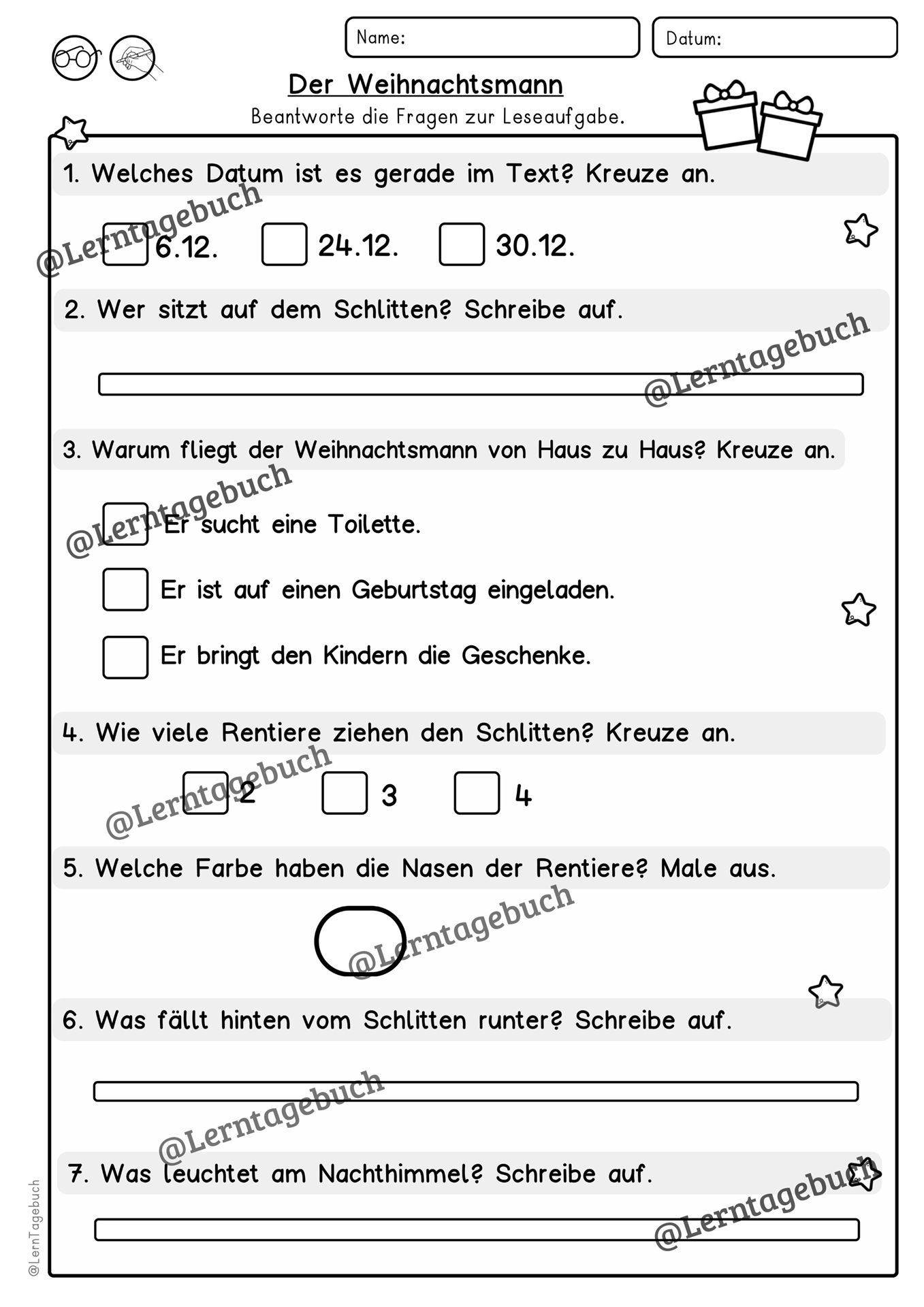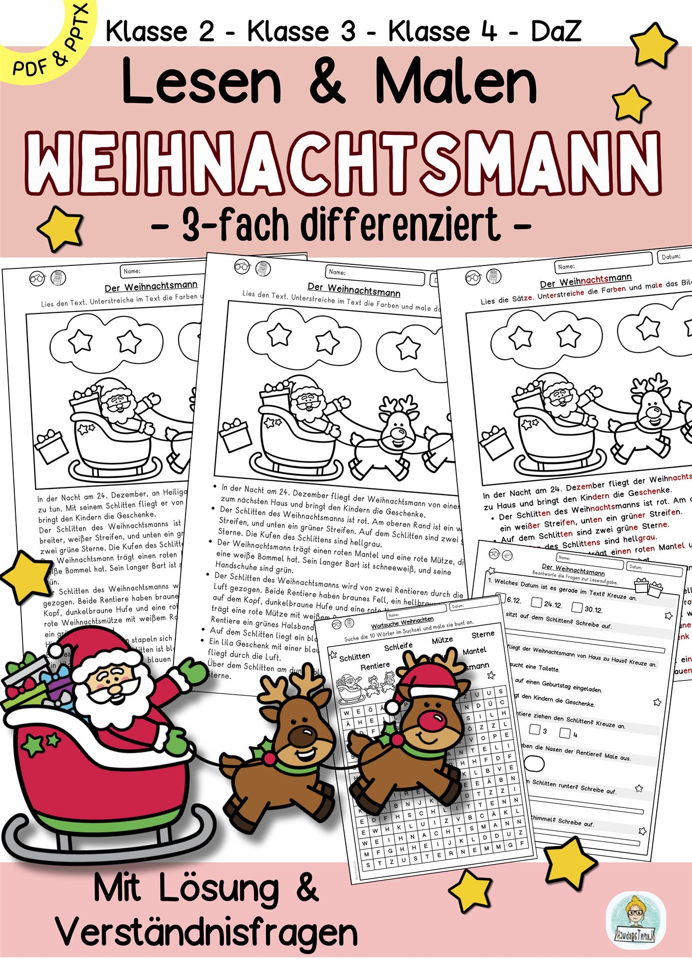 Dreifach differenzierte Leseübung Lesen und Malen Weihnachten/Weihnachtsmann mit Verständnisfragen und Suchsel 📖🎄