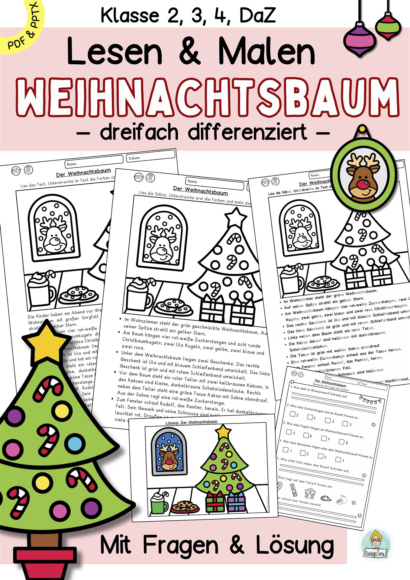 Differenzierte Leseübung: Lesen, verstehen und malen zu Weihnachten. Spielerische Leseaufgabe zum Lesenlernen im Deutschunterricht, Förderunterricht, DaZ-Unterricht, Lesezeit in der Grundschule, bei der Nachhilfe oder als Lesetraining zu Hause.