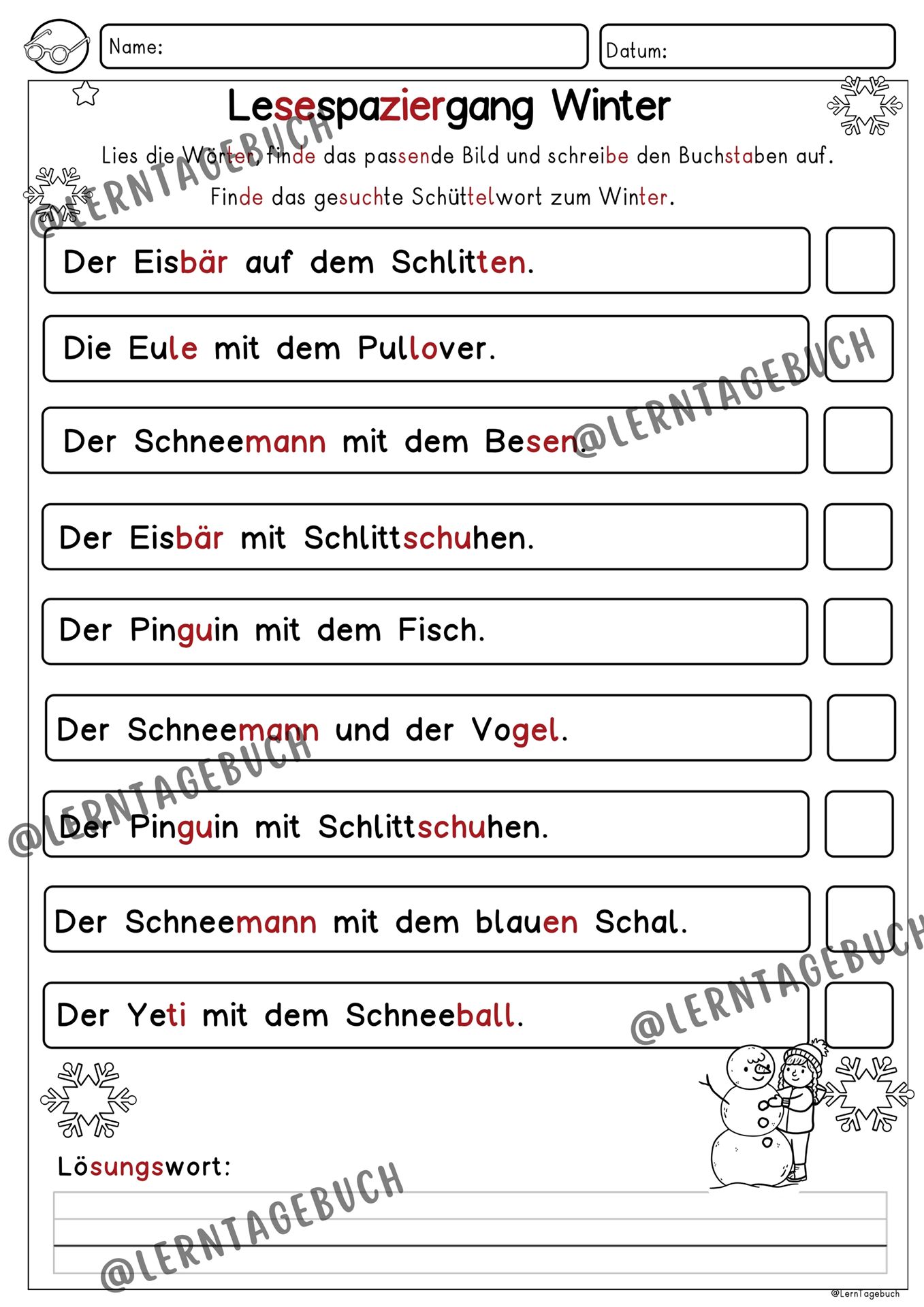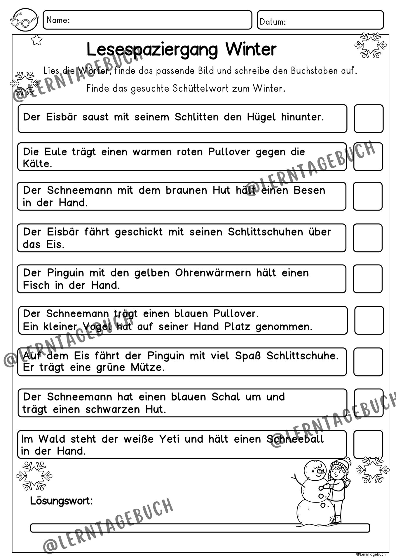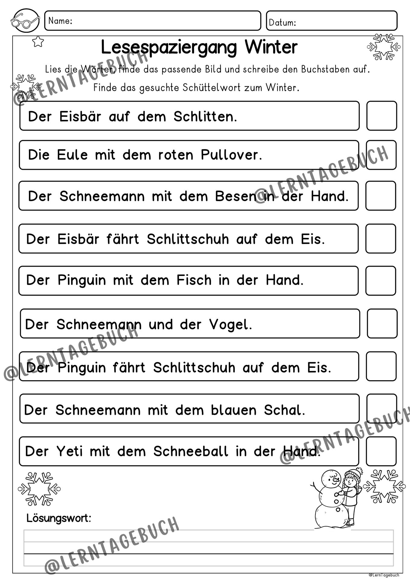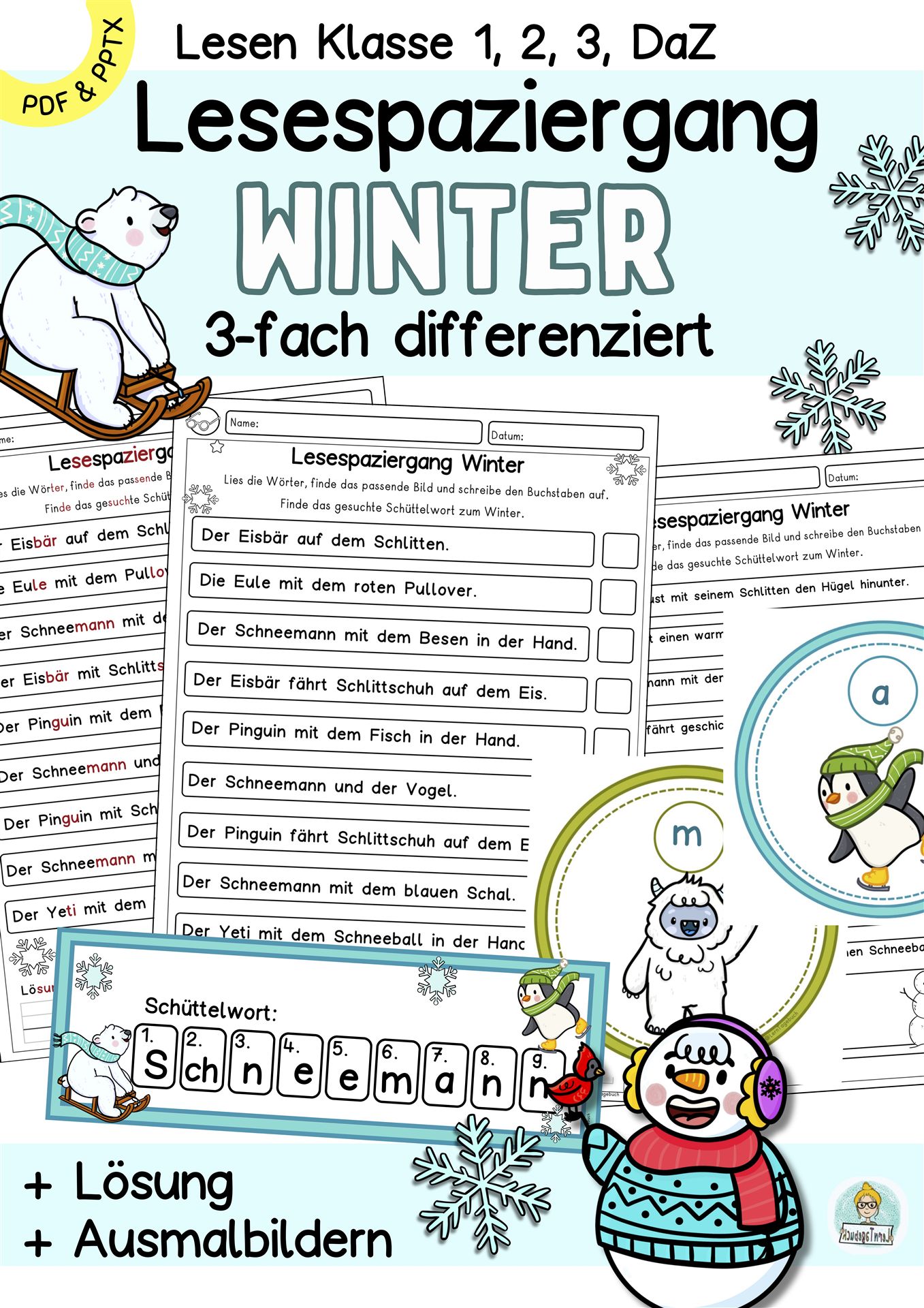Differenziertes Lesespiel: Lesespaziergang zum Lesen lernen im Winter für die 1. Klasse, 2. Klasse, 3. Klasse und DaZ-Unterricht.