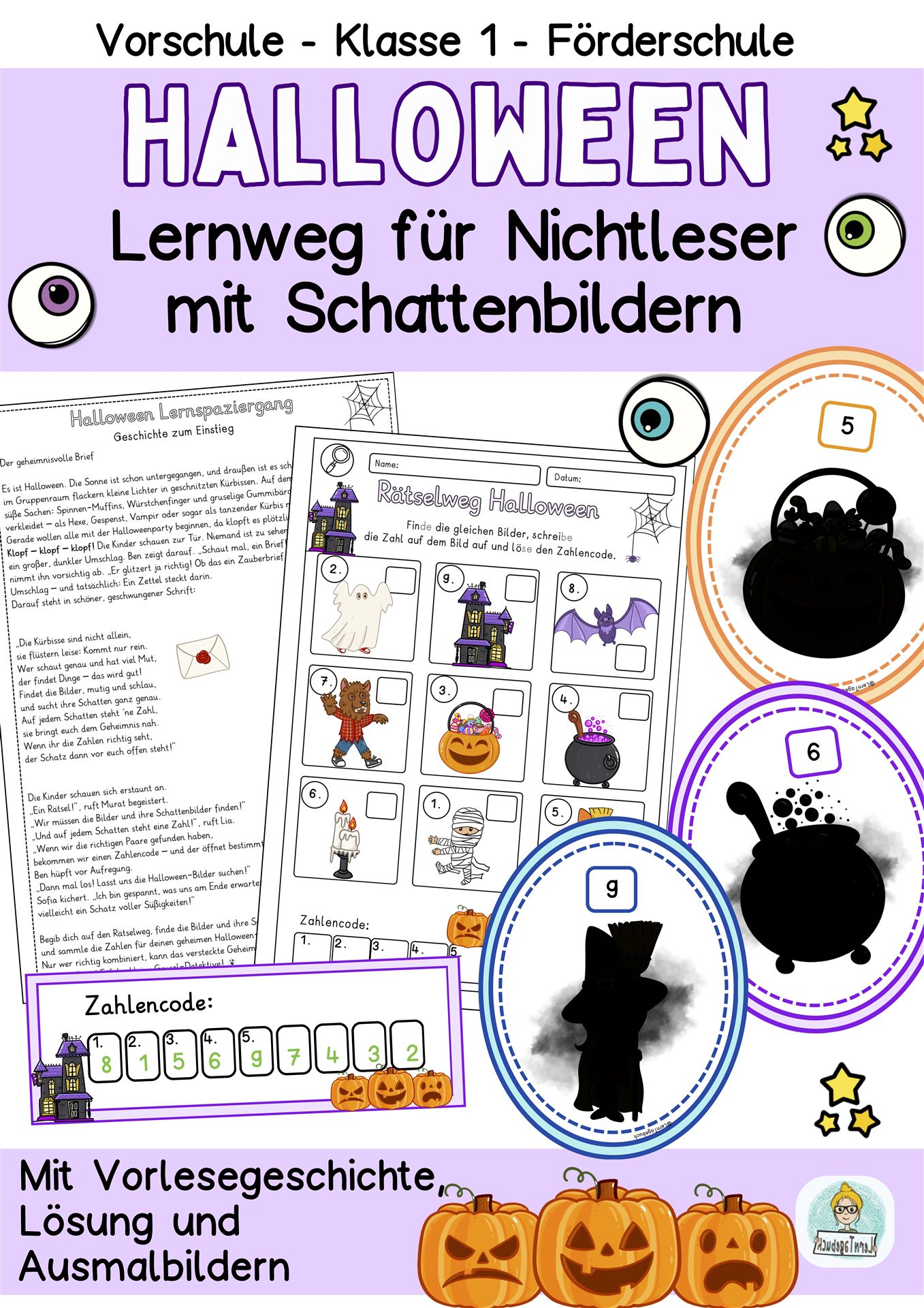 Ein spielerischer Lernspaziergang zu Halloween für Kinder im Kindergarten in der Vorschule, Klasse 1 und als Fördermaterial im Förderunterricht und Förderschule für Nichtleser.