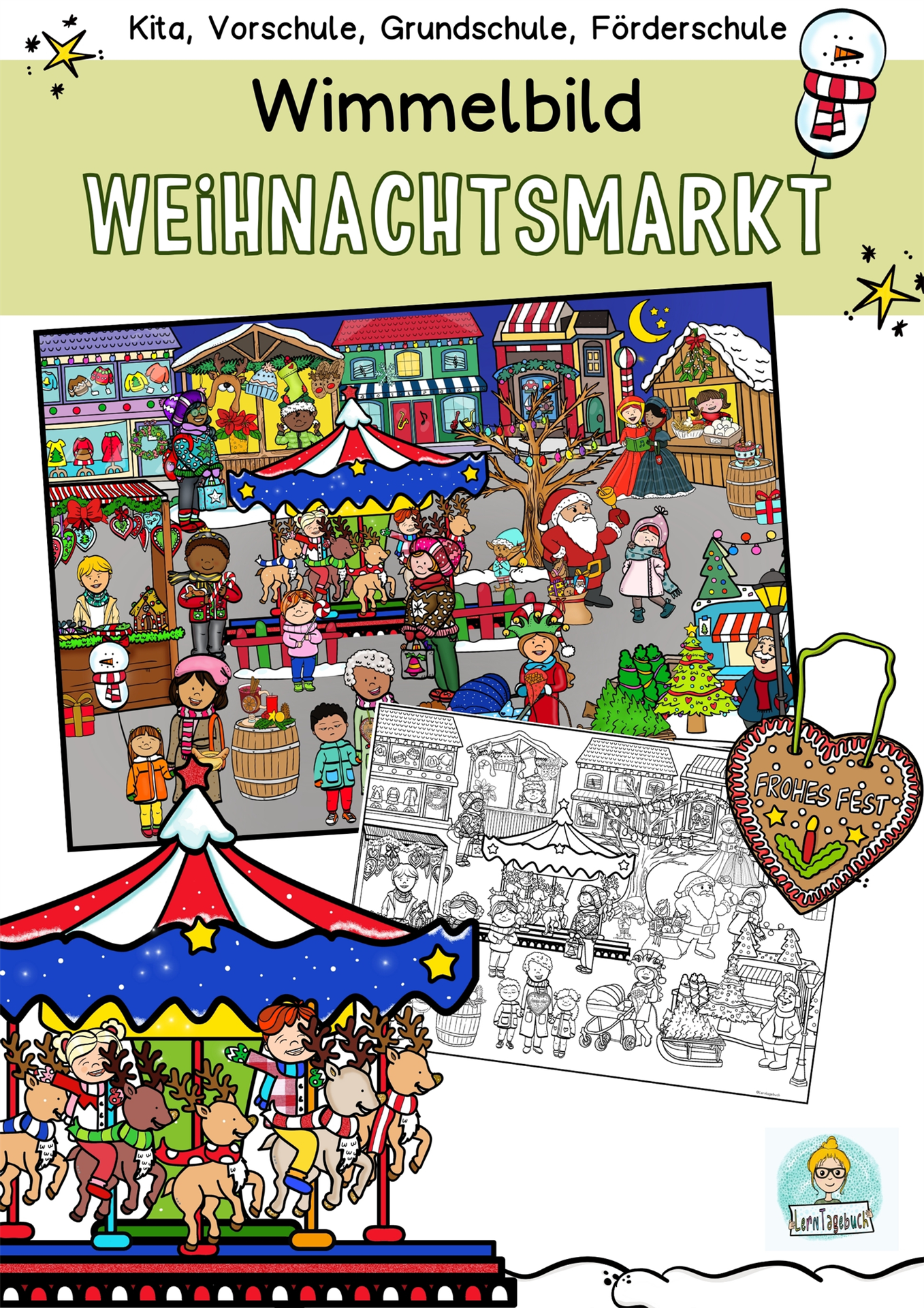 Einfaches Wimmelbild/Suchbild auf dem Weihnachtsmarkt in Farbe und Schwarz/Weiß zum Ausmalen. Ob als Lernmaterial im Kindergarten, in der Grundschule, im DaZ-Unterricht oder als Fördermaterial in der Förderschule.
